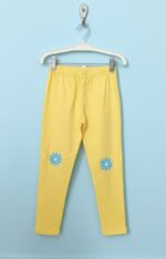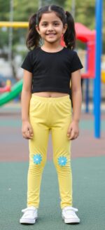 Babyhug Girls’ Daisy Print Leggings – Yellow Comfortable, full-length cotton-blend leggings in a bright yellow hue, featuring cute blue floral knee prints and a flexible elasticated waistband for all-day play.