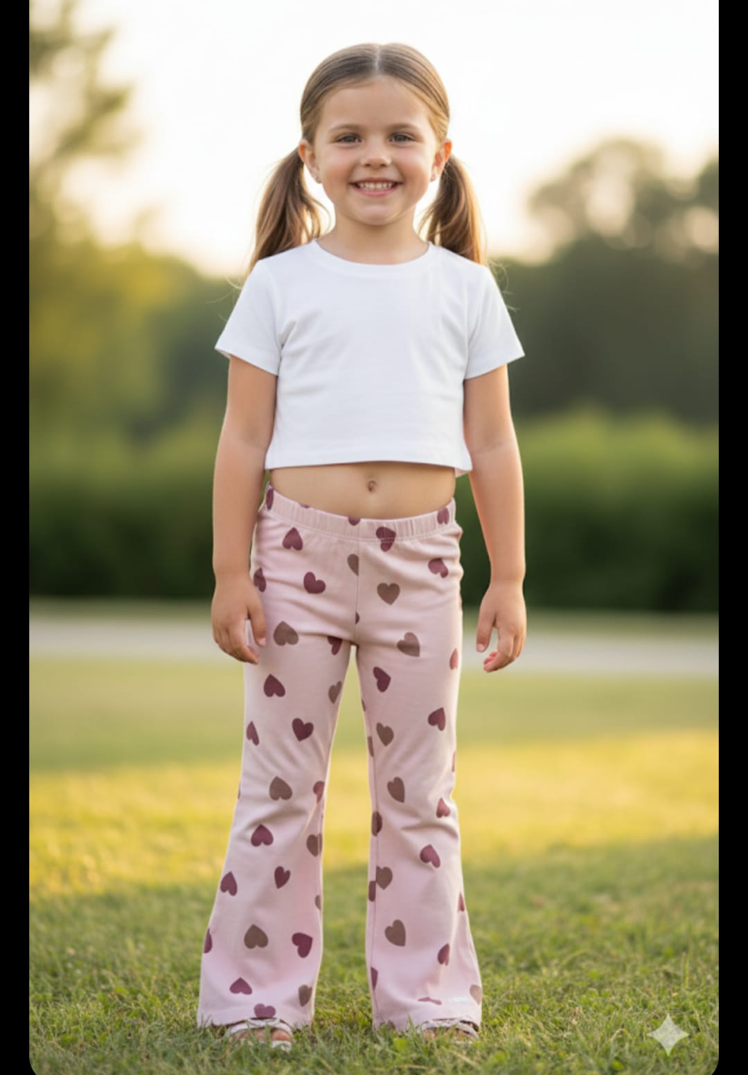 Sweet and stylish, these DKNY leggings feature an all-over heart print on a soft pink base. Designed with a trendy flare leg and a comfortable elasticated waistband, they offer a perfect blend of “athleisure” comfort and playful charm for everyday wear.