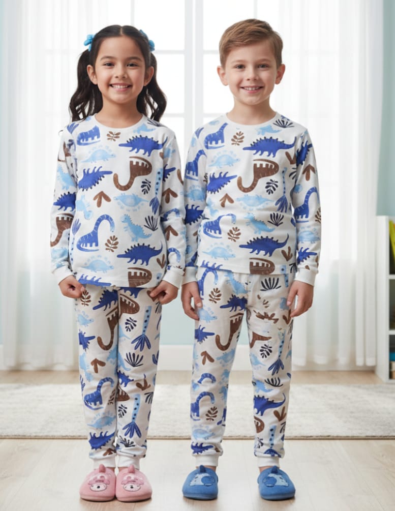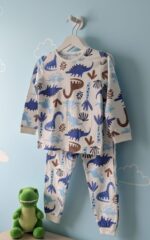 Topomini Kids’ “Dino-Mite” Matching Pajama Set A charming, gender-neutral sleepwear set featuring a playful all-over dinosaur print in shades of blue and earth-tone brown. Crafted from soft, breathable cotton-rich fabric, this long-sleeve top and pant duo ensures a cozy and comfortable night’s sleep for toddlers and young children.