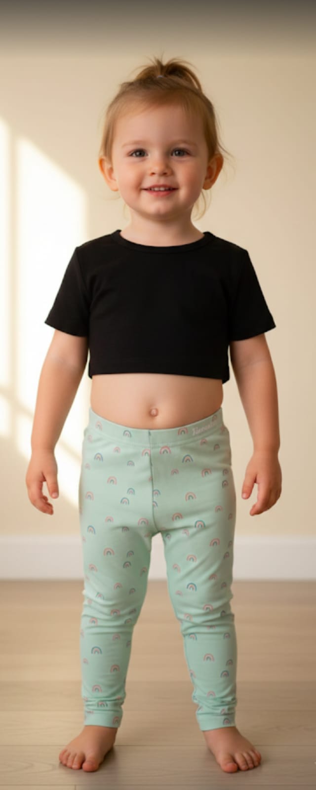 These comfortable, regular-fit leggings are crafted from a soft, stretchable cotton blend (typically around 92% cotton and 5%–8% elastane) for all-day comfort. The design features a light mint green base decorated with a repeated multicolored rainbow motif. Designed for durability and ease of movement, they include a standard elasticated waistband and are machine washable, making them a practical choice for everyday wear.