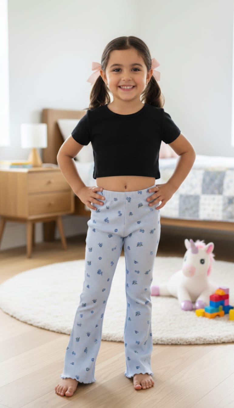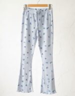 Light blue, floral-print flare pants featuring a ribbed texture, elastic drawstring waistband, and delicate lettuce-edge hems. A cozy yet stylish piece for lounging or casual outings.